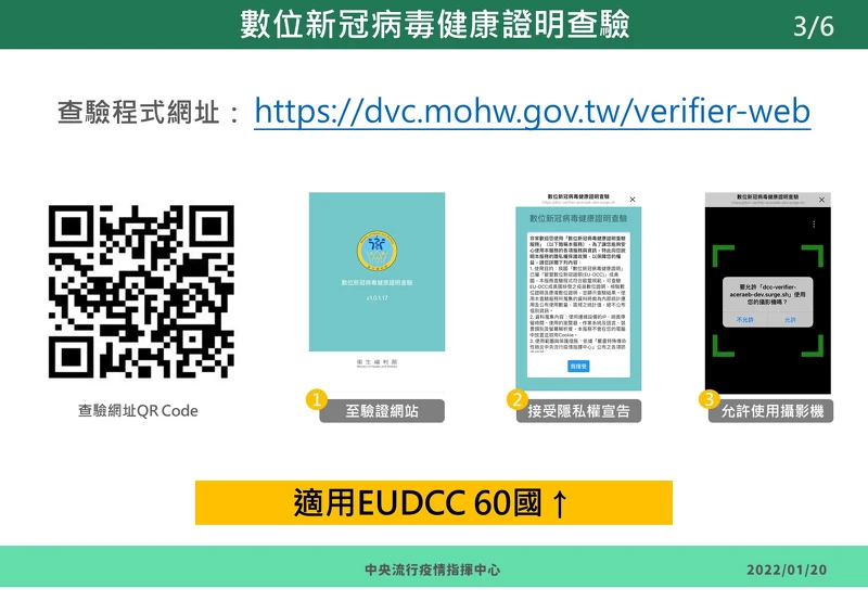「數位新冠病毒健康證明」查驗網頁:https://dvc.mohw.gov.tw/verifier-web
