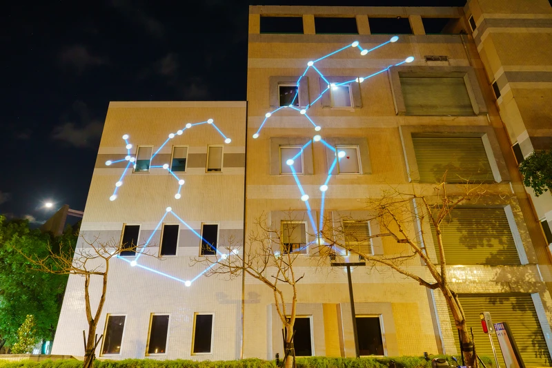 天文科學教育館牆面有著年輕藝術家利用地面投影出「台北星空」,又潮又炫又呼應在地特色,還有活水月光噴泉的光點象徵著希望與豐足,如同奔湧的泉水般源源不絕。河濱光樹之舟載著滿滿的希望如繁星點點,航向未知的旅程。