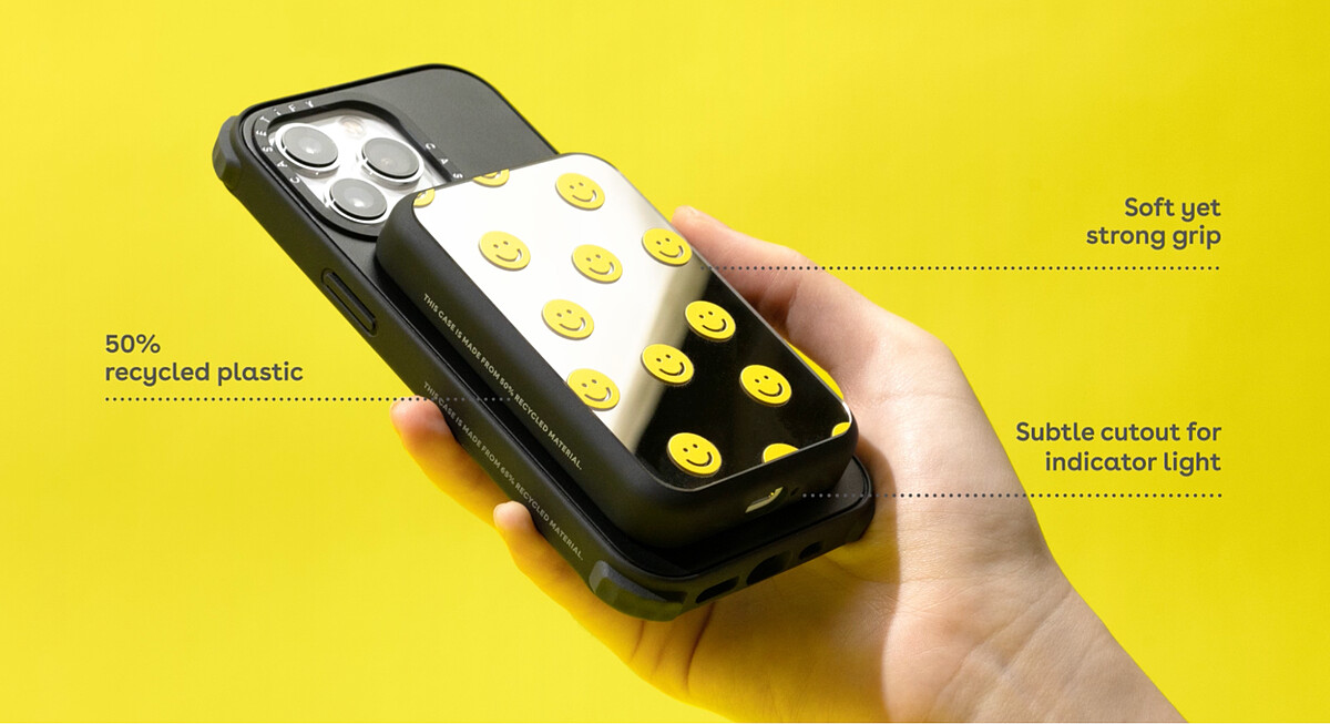 CASETiFY的MagSafe 便攜充電器保護套由 50% 回收塑膠製成,在耐用、安裝簡易的同時,也具有十分柔軟舒適的手感,是便攜充電器的最佳拍檔。 100% 可回收包裝及環保油墨印刷,在保證產品質量的同時也能有效減少碳排放,更加環保。