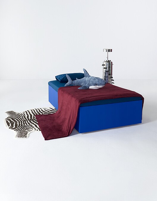 以四月就要停產的 IKEA 鯊魚為創作靈感,藉由鯊魚從不睡覺,但大家買它卻是做為睡眠陪伴的消費行為,諷刺地表達人類與動物的關係。作品的物件緊扣海洋元素,藍色象徵大海與自由,勃根地紅的毯子象徵血腥,形象可愛、陪伴人類入眠的鯊魚,最終被人類以殘酷的方式傷害,地上的虎皮地毯則雙重呼應動保議題,以幽默、童趣的方式,包裝殘酷且哀傷的訊息,讓人在親近作品的同時,啟發深沉的思考。