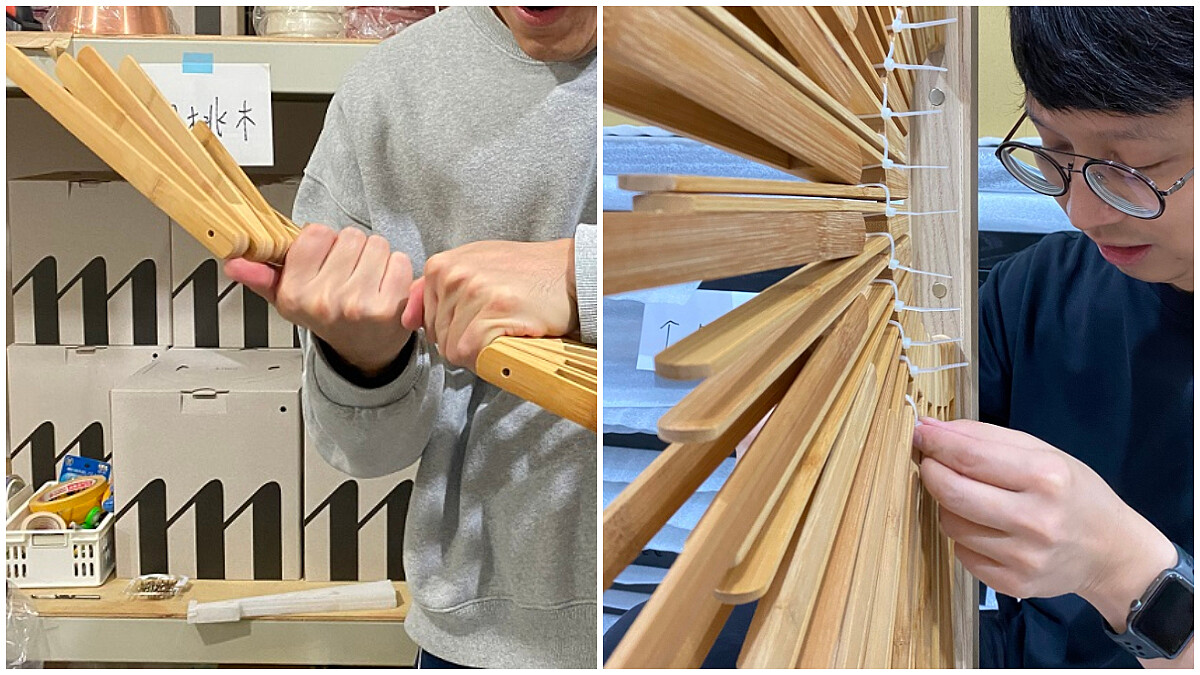 有別於過往概念先行的創作方式,特別創作的《扇變屏風-Bon Appétit》從材料開始發想,特殊的創作經驗也讓製作過程充滿挑戰,「這件作品是反地心引力的,上面的架子可能會掉下來,要讓它既能立體有弧度,還得兼顧不掉落,是最難的部分。加上我們是工業設計師,做模型的時候最重精準度,但竹子精準度較低,要把幾十個幾乎沒有公差的東西組合起來相對困難。」