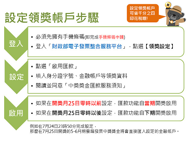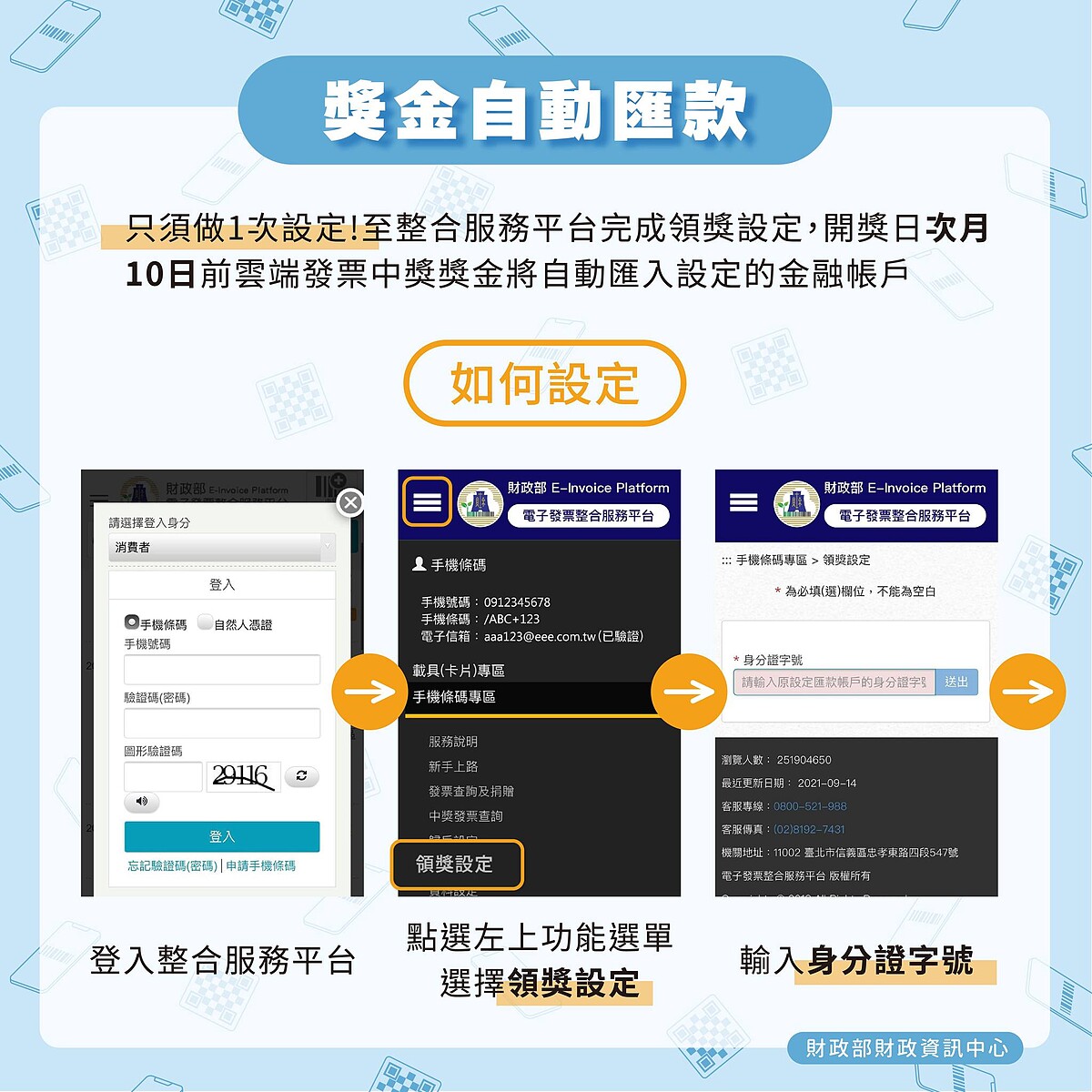 而在財政部電子發票整合服務平台「領獎設定」設定一次即可,省時又省力,並且避免忘記領獎、逾期無法領獎!如果同時在「財政部電子發票整合服務平台」及「統一發票兌獎」APP設定領獎金融帳號,中獎時,獎金將直接匯入財政部電子發票整合服務平台設定的金融帳號!