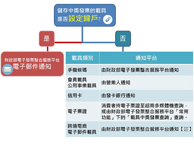 1、使用手機條碼儲存雲端發票或已辦理歸戶者,財政部電子發票整合服務平台會主動通知中獎訊息。