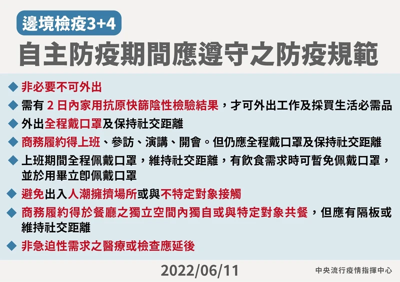 (一) 入境日為第0天,進行3天居家檢疫及檢疫期滿後接續4天自主防疫,取消原7天自主健康管理。