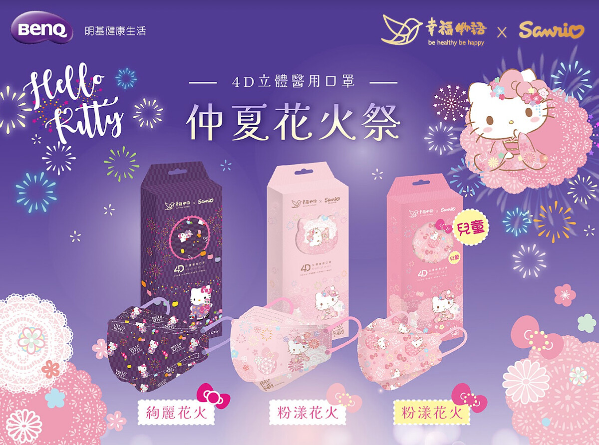 營造偽出國的感覺,幸福物語這回與Hello Kitty聯名全新口罩,特別以「仲夏花火祭」為主題,透過釋放多彩的煙火慶典,希望各位能在疫情下鬱結的心得到撫慰。