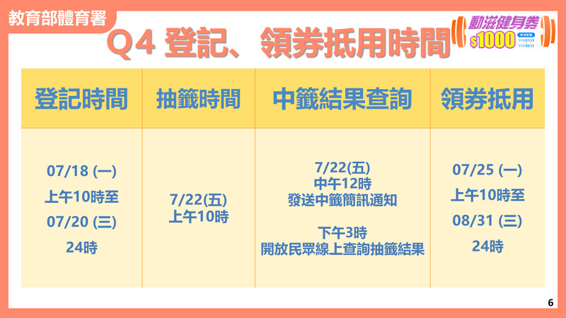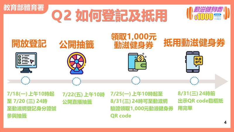 7月18日(一)上午10時開放登記至7月20日(三)晚上23時59分59 秒截止,採先登記後抽籤,再領券機制,登記方式請上動滋網 (500.gov.tw) 點選「登記動滋健身券」,填入身分證字號或統一證號登記。