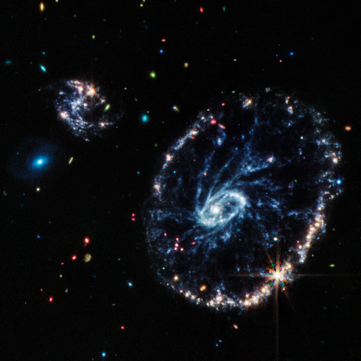 這張星系照由近紅外相機(Near-Infrared Camera)、中紅外線儀器(Mid-Infrared Instrument)合成,帶領人類看到更多細節。美國航太總署NASA、歐洲太空總署(European Space Agency)在聯合演說形容「像是朝著池塘丟石頭,造成擴散的漣漪。」