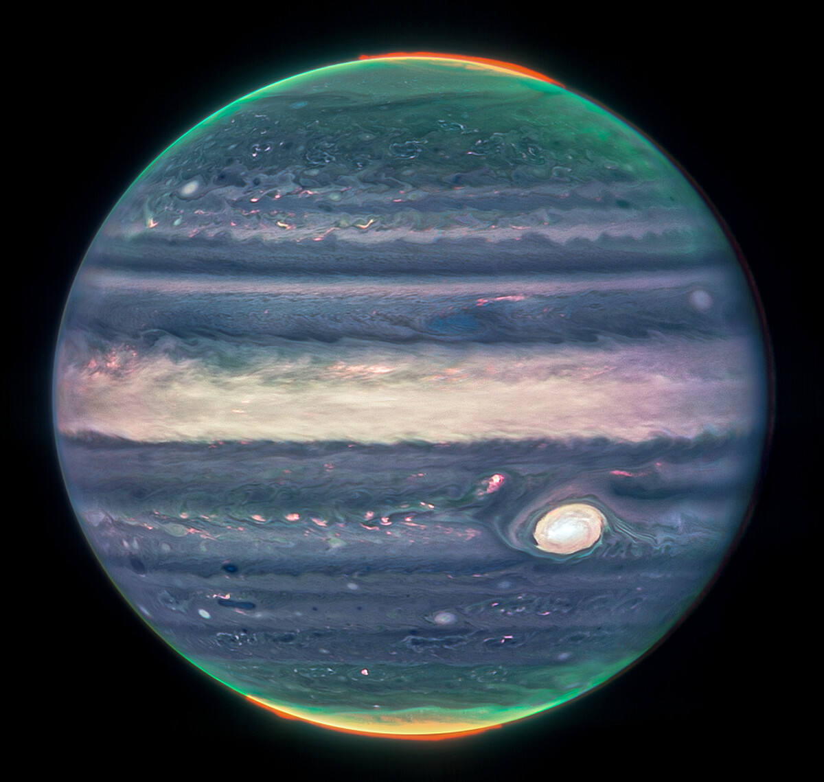 而照片中右下角、搶眼的「大紅斑」(Great Red Spot),是規模巨大到足以吞噬地球的反氣旋風暴。是不是開始期待韋伯太空望遠鏡接下來的宇宙新發現呢?