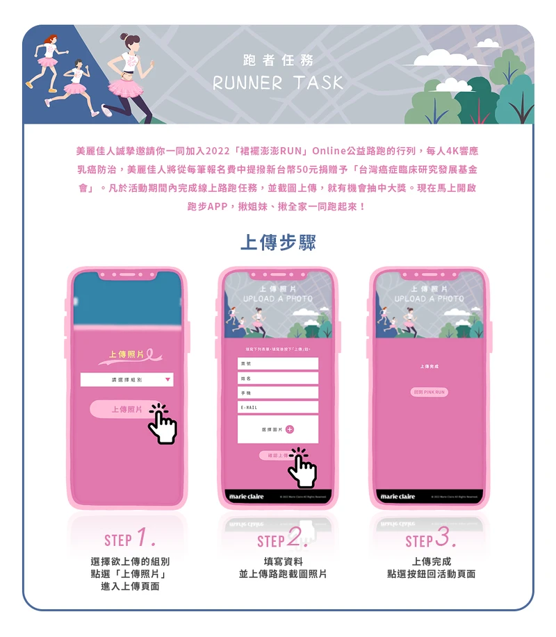 「跑者任務」活動中,每位跑者可獨立完成4K(或以上),也可以邀請閨蜜、家人、4人好友等組合一同齊跑響應乳癌防治。只要在活動期間內完成線上路跑任務、並截圖上傳,就有機會抽中大獎。