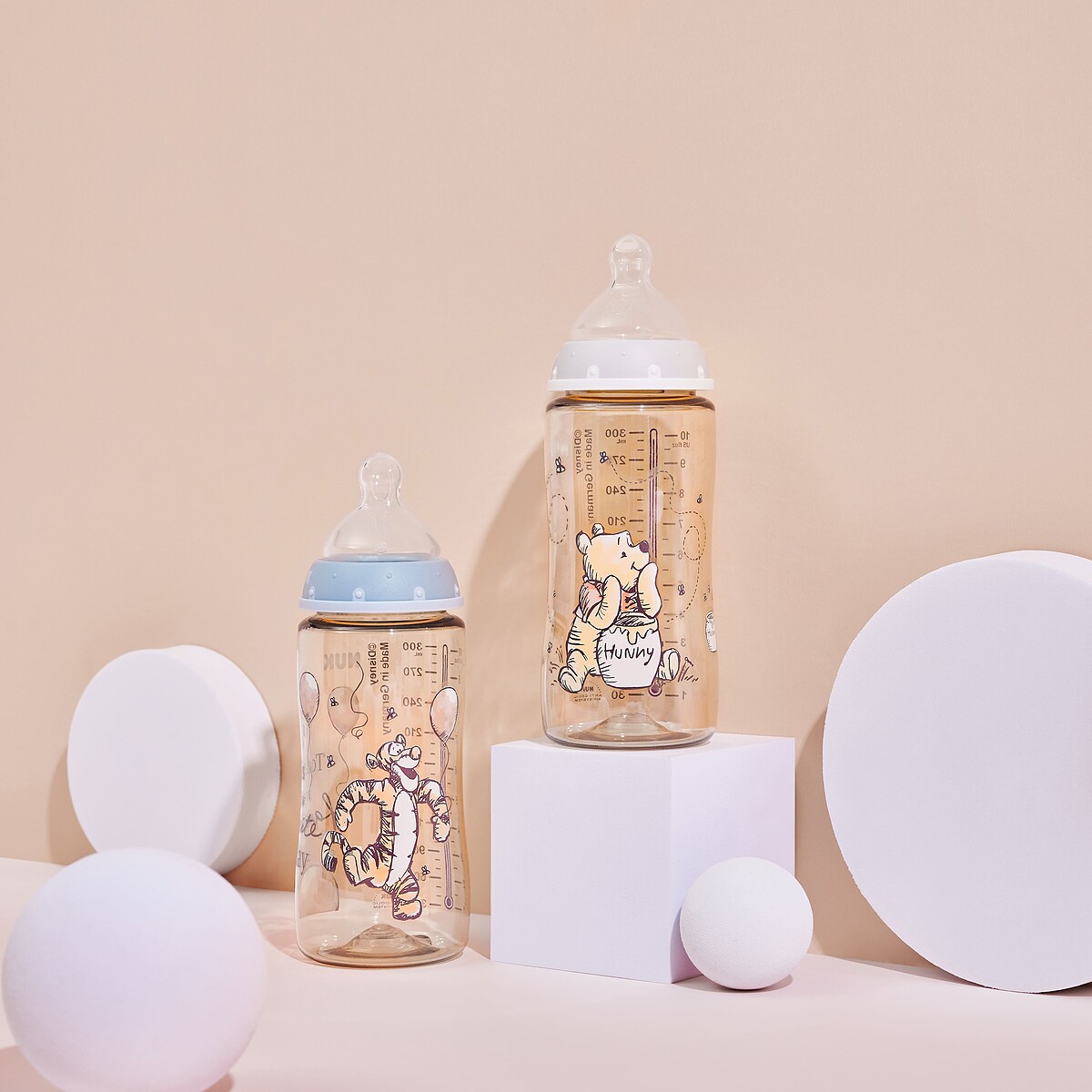 但深入了解後更吸引人的重點是:「NUK X Disney小熊維尼聯名新生兒禮盒」中的兩支奶瓶不只外觀可愛,它可是運用了德國先進黑科技,母嬰界首創的「PPSU感溫奶瓶」,具有高溫變色預防燙傷的聰明功能!許多家有新生兒的媽媽都該知道,小兒科醫師會建議用70℃以上溫熱水沖泡奶粉,並讓奶水降溫至約40℃,才是最合適哺餵寶寶的溫度…但沒有這款奶瓶前,媽媽們多半得靠手感試溫(超不精準);有了NUK超聰明的「PPSU感溫奶瓶」後,只要看奶瓶上的感溫條----白色是超過42℃,需要再等一下讓奶水降溫,藍色是37℃,可以放心哺餵寶寶。如此簡單直觀的設計,幫爸媽輕鬆管理好孩子喝的奶水溫度,把溫度最剛好、不燙口的ㄋㄟㄋㄟ,送到最親愛的小寶貝口中!