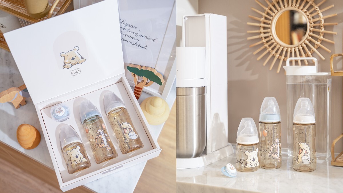 Ellie說「NUK X Disney小熊維尼聯名新生兒禮盒」裡兩支「PPSU感溫奶瓶」,讓她在幫寶寶泡奶時更得心應手,「奶瓶上感溫條顯示藍色,就是約莫40度可以放心讓寶寶吸食」讓媽媽好安心!仿母乳拇指型奶嘴,更是幫助媽媽親餵瓶餵輕鬆轉換,讓寶寶好吸吮及齒列矯正,預防寶寶脹氣的貼心夥伴。當寶寶長大了,可愛的奶瓶也不用淘汰,「只要加上內附的防溢墊片,就能變儲存瓶,放孩子的小零食、小玩具,一瓶多用很環保!」完全是兼具實用性與收藏價值的育嬰精品。