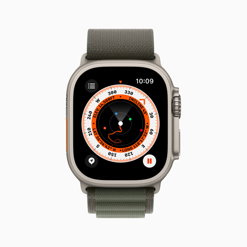 為了讓Apple Watch Ultra 能應付日常與極端的環境,在watchOS 9 中完全重新設計的「指南針」app ,為了能夠更深入的呈現資訊,共有3種不同的畫面顯示。而全新的指南針 app 能夠同時呈現類比指南針錶盤與數位檢視。轉動數位錶冠可進一步放大,獲得包含緯度、經度、海拔和坡度在內的資訊,以及會顯示「指南針航點」和「回溯」的定向越野檢視。