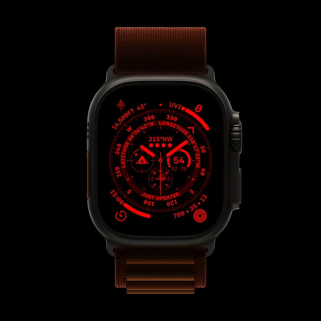 為了針對夜間情境最佳化,使用「尋路者」錶面時,旋轉數位錶冠可將介面轉變為紅色,提升使用者在黑暗環境中的可視性。