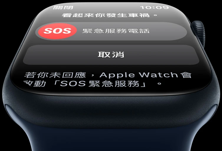 當Apple Watch 8偵測到嚴重車禍發生時,會要求使用者回報,若 10 秒內未收到回應,就會自動撥打緊急服務電話。 緊急救援人員將收到使用者的裝置定位資訊,使用者的緊急聯絡人也會被同步通知。
