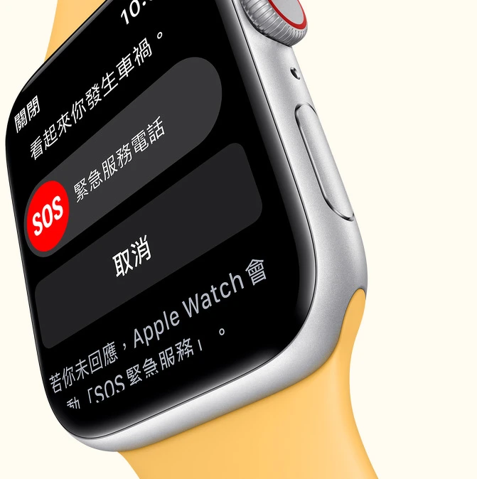 同樣具有車禍偵測功能,當Apple Watch SE一旦偵測到劇烈撞擊,「車禍偵測」可自動為你聯繫緊急服務,向救援單位提供你的位置,並同步通知緊急聯絡人
