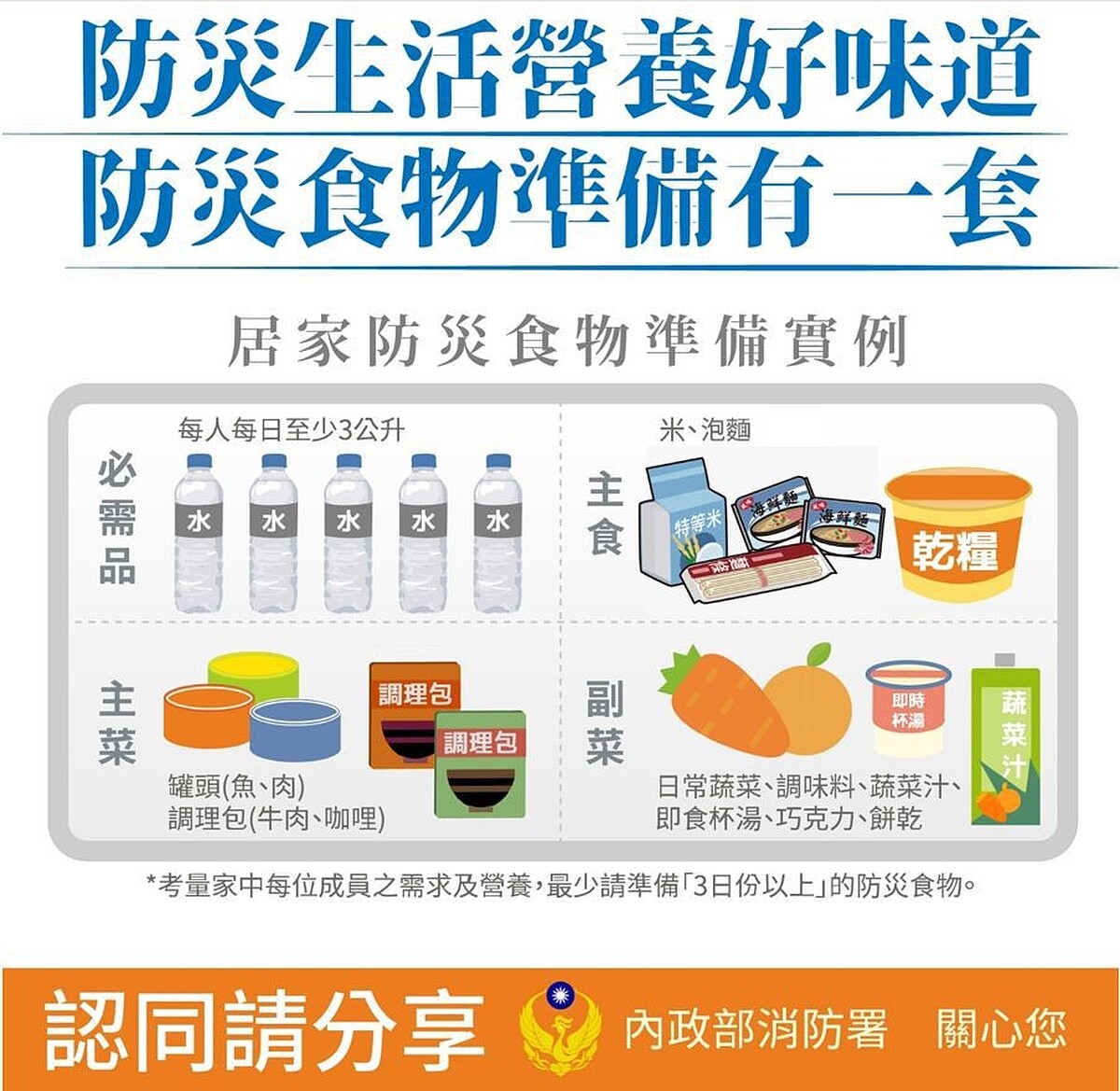 內政部消防署因考量家中每位成員所需及營養,建議最少準備「3日份以上」的防災食物。