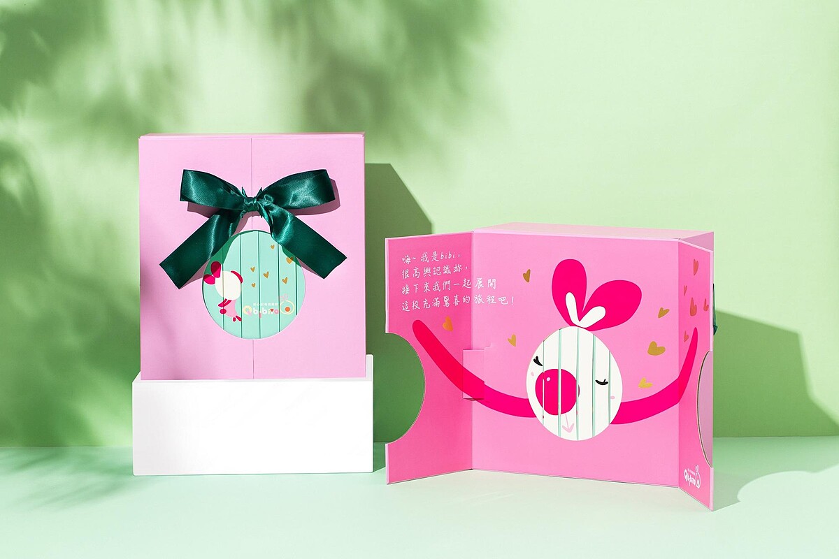 Qbibiya新生兒禮盒在設計上,以粉色與綠色的粉嫩色調為主,透過華麗蝴蝶結的點綴,帶出新生命誕生那種珍貴且溫馨的喜悅氛圍,並注入品牌自行設計的IP娃娃 bibi兔來增添萌感,拆禮物開啟盒子的過程中,也會看到象徵圓滿與媽媽孕肚的蛋型設計,拉開後自成一款寶寶拉拉書的結構設計,以及開啟過程禮物會緩慢上升的巧思,在在都充滿了令人感動不已的儀式感。