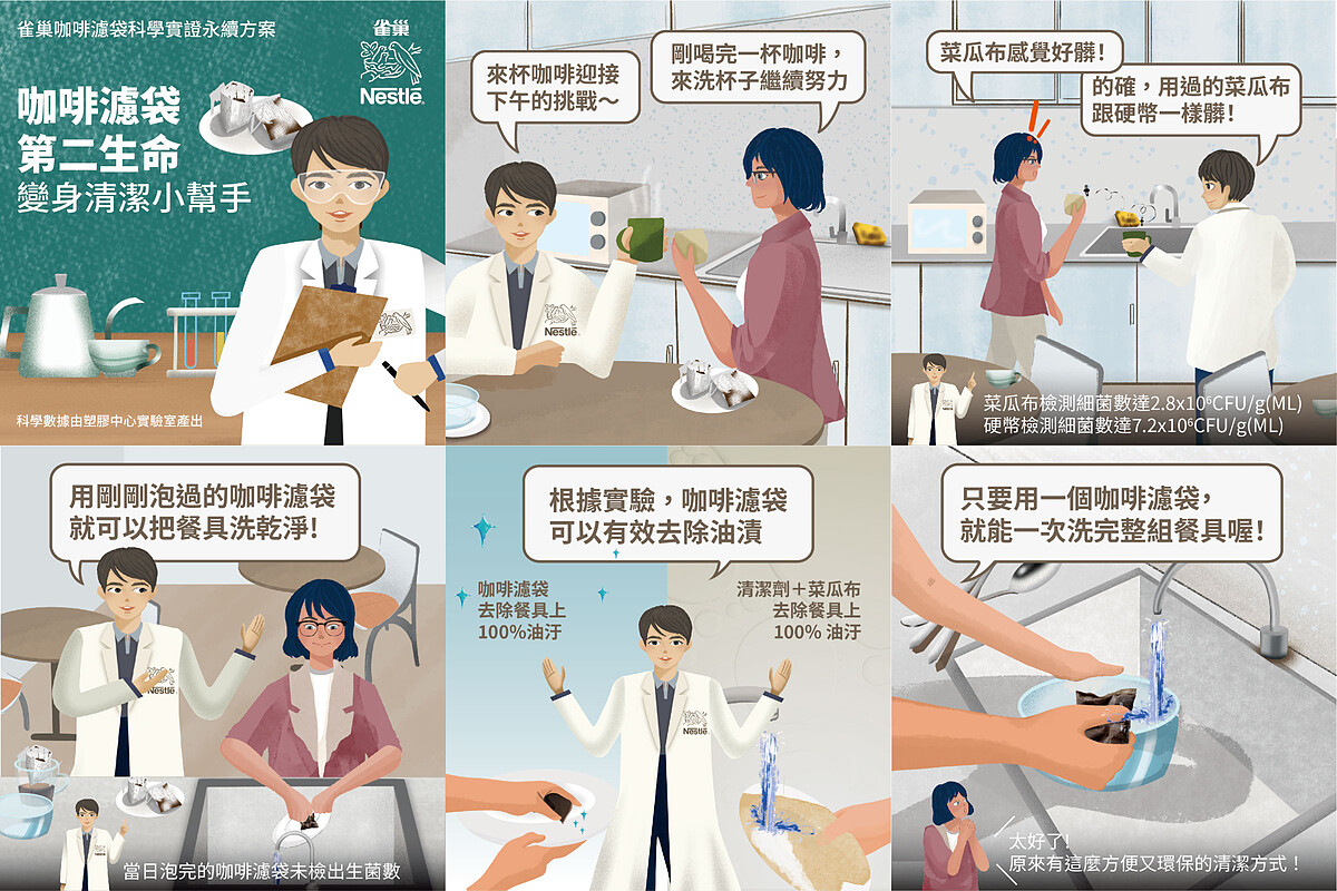 (2)與財團法人塑膠中心合作以科學實驗數據驗證咖啡濾袋清潔功能,堪比市售清潔劑與菜瓜布!針對飲用萃取完畢的雀巢金牌現萃研磨咖啡包、雀巢金牌濾掛咖啡,透過塑膠中心實驗室以實驗數據證實咖啡包、濾掛咖啡的清潔效益在特定使用條件下清潔功能堪比市售清潔劑與菜瓜布;鼓勵消費者在享受咖啡之餘可以延長咖啡濾袋的壽命,更可以節省菜瓜布、清潔劑用量。同時,為使消費者能更簡易的瞭解實驗數據,塑膠中心更以圖文漫畫的方式呈現咖啡濾袋永續的使用方式。完整圖文及報告請參官網頁面(https://reurl.cc/AO50OQ )。