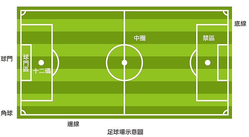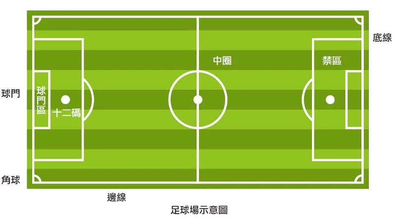 必須是長方形,邊線長度從最短的90公尺至最長的120公尺,寬度從最短的45公尺至最長的90公尺。並按附圖劃上禁區、中場線、中圈等區域。