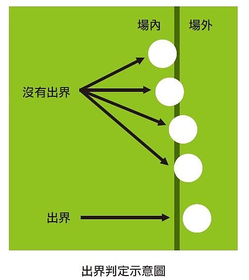 無論球是從門柱、角球旗或碰到裁判反彈回來,球仍是在比賽中。無論球在地面或空中,當整個球全部超越邊線或底線外,球便在比賽之外。