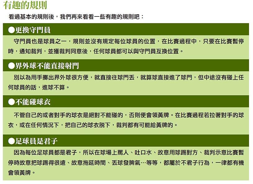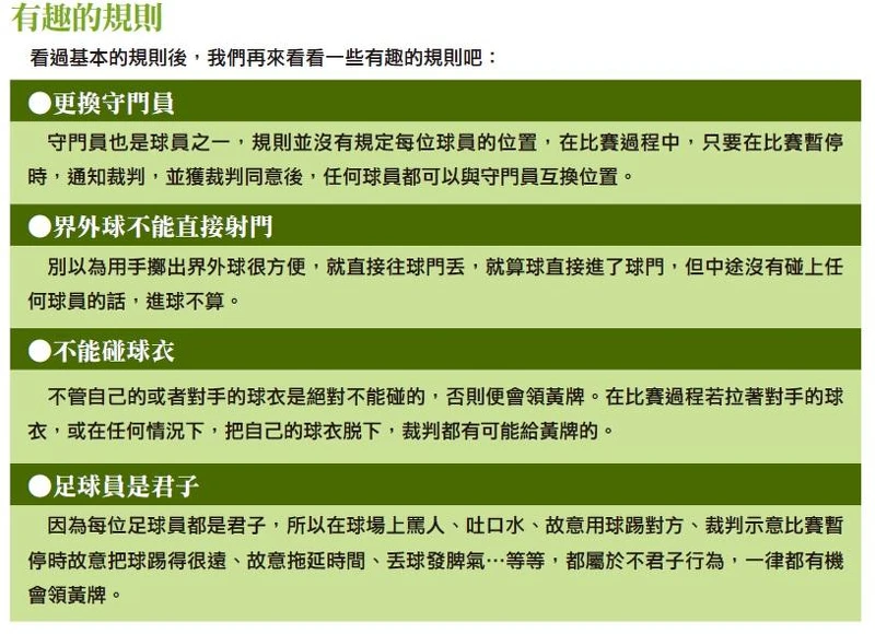 既然是簡單,當然仍有很多規則未能一一介紹,所以,本章所說的,只能讓剛接觸足球的朋友,在看足球比賽時,可以了解多一些,增加看球的娛樂性。以下的規則是11人比賽所使用的,希望能幫助大家去欣賞真正的足球比賽。