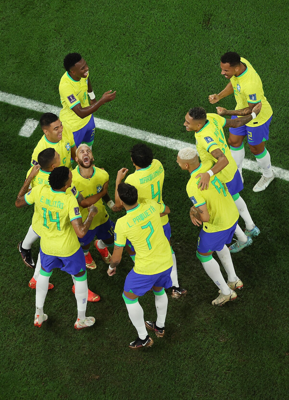 對上南韓上半場比賽中就瘋狂得分,才7分鐘就進球,巴西隊員集體跳起了森巴舞,超可愛!而內馬爾得分後,全隊繼續大跳森巴舞慶祝,最後連進球後教練也high起來一起跳,看巴西隊的森巴舞整齊劃一的動作,看起來平常不只一起練習踢球,還團練森巴舞!