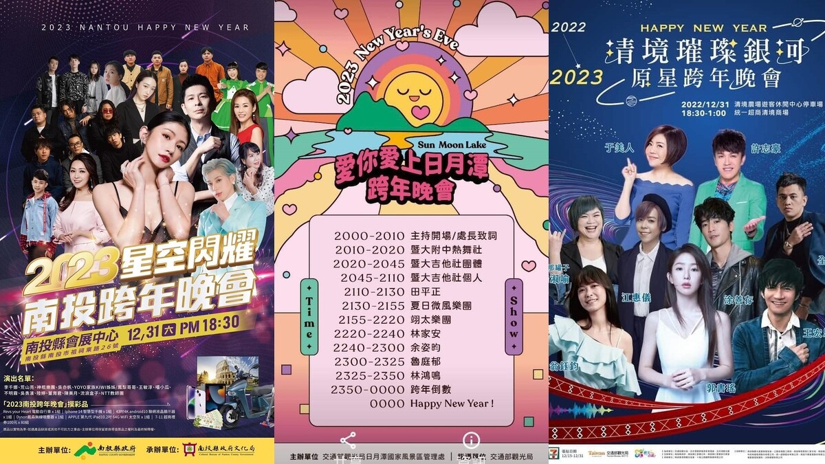 南投跨年活動將於三地同步舉辦!會展中心的「星空閃耀、南投跨年晚會」會有李千那、荒山亮、神棍樂團、吳亦帆等14組歌手演出;清境農場的「2023清境璀璨銀河、原星跨年晚會」則有于美人、許志豪、郭書瑤等人齊聚倒數,元旦還有升級典禮;「2023愛你愛上日月潭」則會於水社碼頭、伊達邵碼頭施放8分鐘煙火,熱鬧到不行!