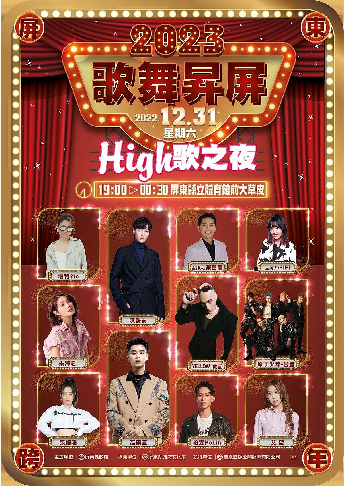 南部人衝一波!2023屏東跨年晚會「歌舞昇屏 High歌之夜」會有10組超人氣卡司帶來長達5小時不間斷好歌!歌手名單有陳勢安、金曲最佳新人壞特?te、艾薇、原子少年金星、金曲台語歌后朱海君、張語噥、柏霖,並由YELLOW黃宣擔任倒數前演唱,最後則有高爾宣壓軸。現場還會有在地農漁特產品、特色美食小吃、手作文創商品,讓大家用最開心姿態迎新年。
