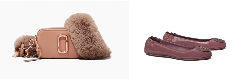 MARC JACOBS The Snapshot仿真兔毛揹帶相機包 推薦價19,900元;TORY BURCH Minnie Travel平底鞋 推薦價12,900元。