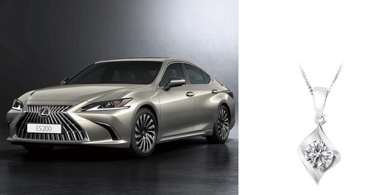 台北信義新天地首獎-LEXUS ES 200頂級版、台中中港店首獎-LAZARE鉑金L’eau一克拉鑽墜。