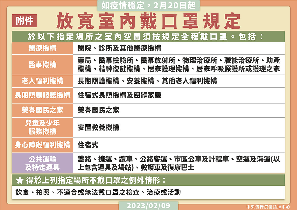 除了上述室內空間及特殊情境外,其餘室內場所、室內空間,等2月20日後將由民眾自主決定是否戴口罩。