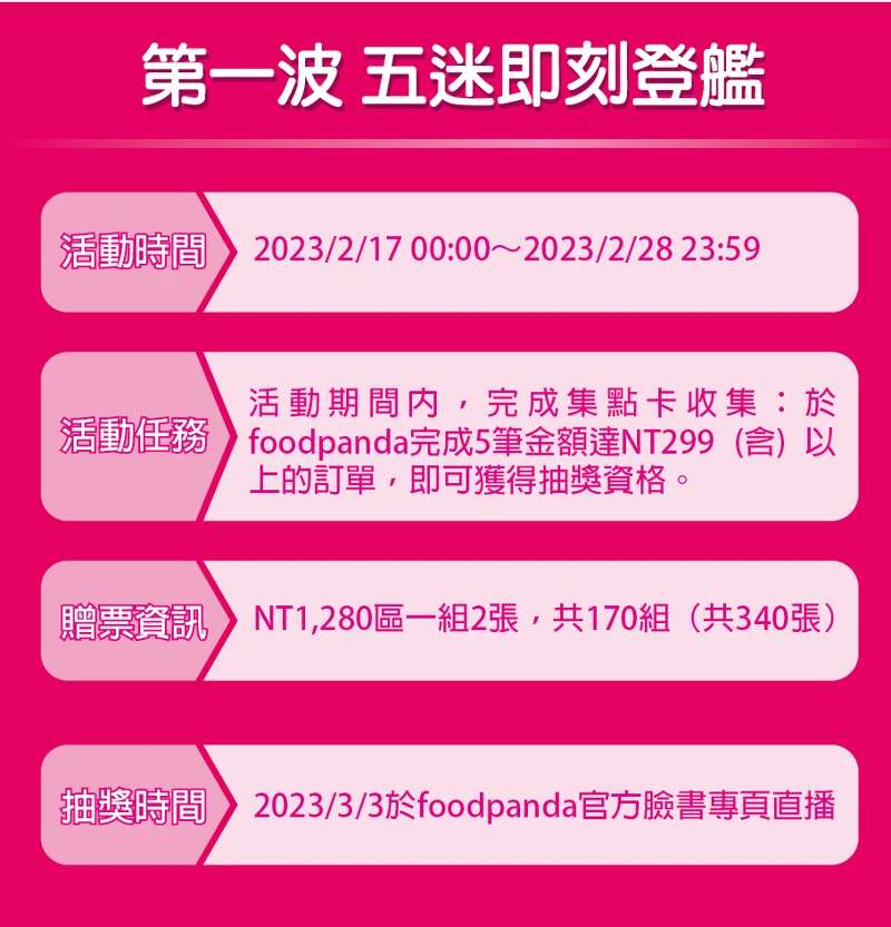身為生活中已經沒辦法不叫foodpanda送~的我們,這活動門檻超容易是不是超心動!根本一塊小蛋糕~更多foodpanda【五迷即刻登艦】、【五迷航向無限】五月天《諾亞方舟 10週年進化 無限放大版》演唱會門票的抽獎活動,請詳細參考活動官網:https://www.foodpanda.com.tw/contents/mayday2023