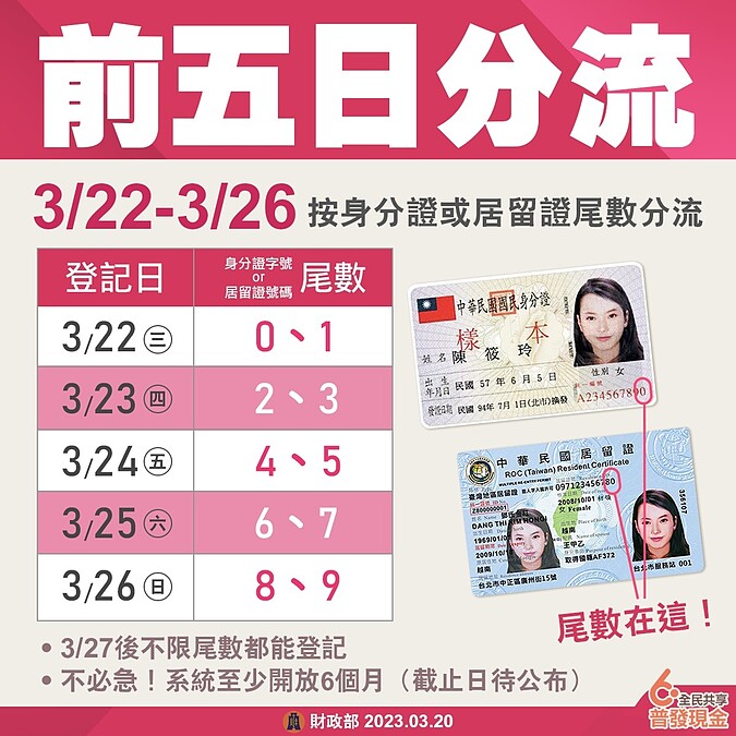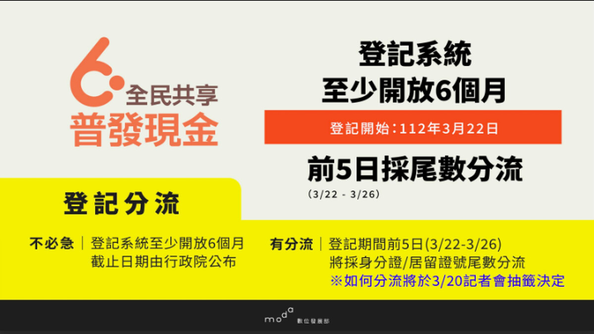 數位部發展部在3月16日公布了6000元線上申請登記入帳的領取方式,為了讓民眾能夠更加順利線上申請登記,登記期間前5日(2023/3/22至3/26)將「採取身分證字號或居留證號尾數方式分流」,每日開放兩組尾數的民眾登記,並將在3月20日以抽籤決定尾數分流順序。而3月27日起不分流,民眾皆可申請登記,並於3月28日起開放修改以及查詢登記資料是否正確、符合領取資格等資訊。登記系統預計開放至少6個月,確切截止日期以行政院公布為準。