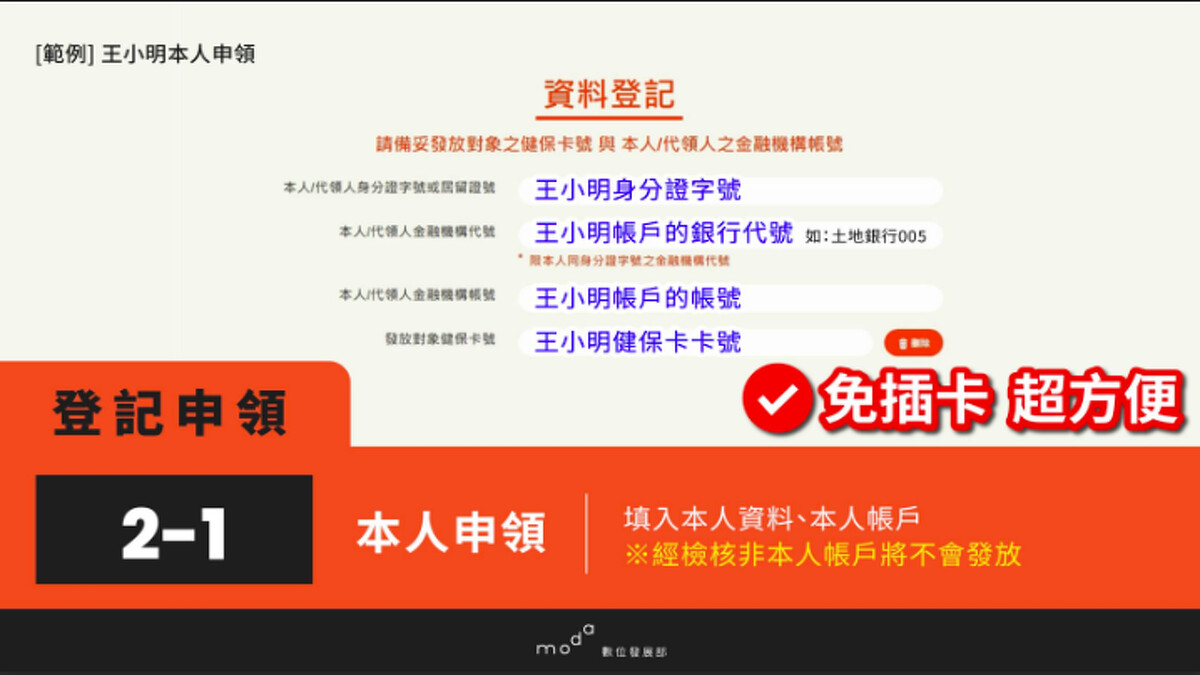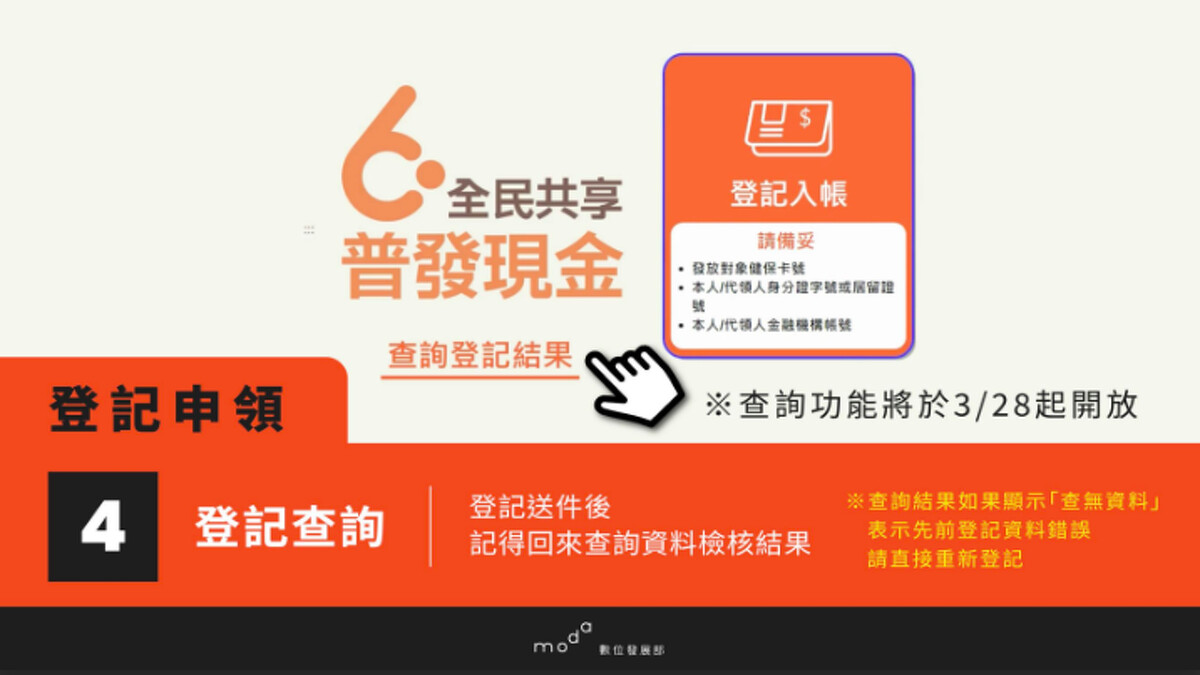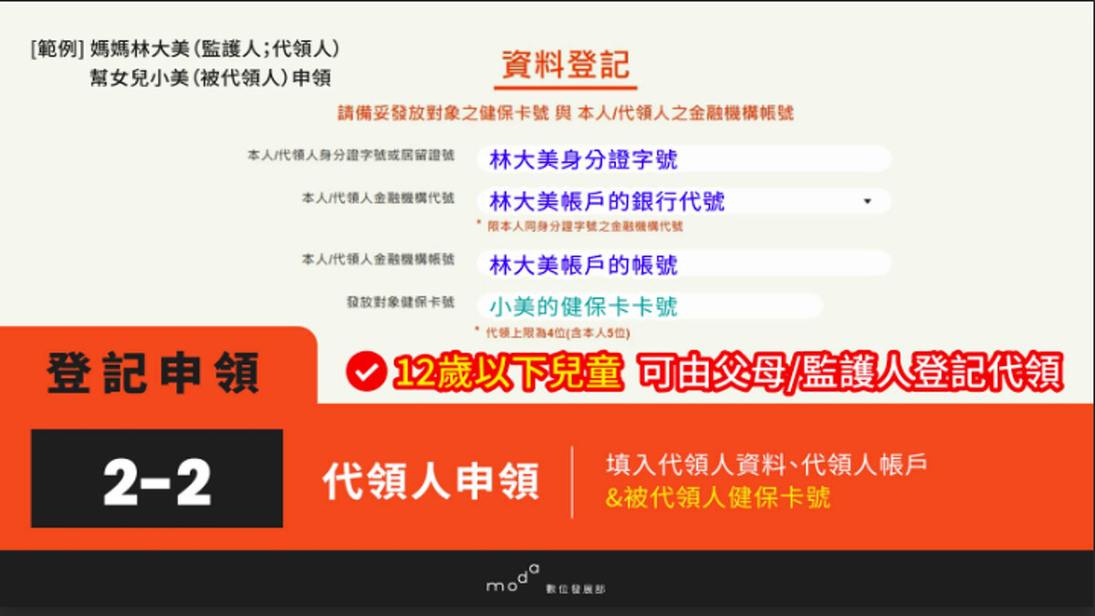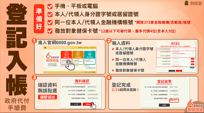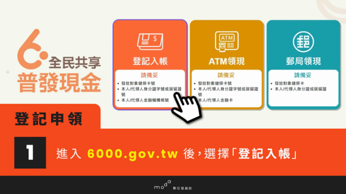 數位部說明,線上申請登記入帳原則由本人登記,父母或法定代理人可為未滿13歲的未成年子女代領。登記步驟如下: