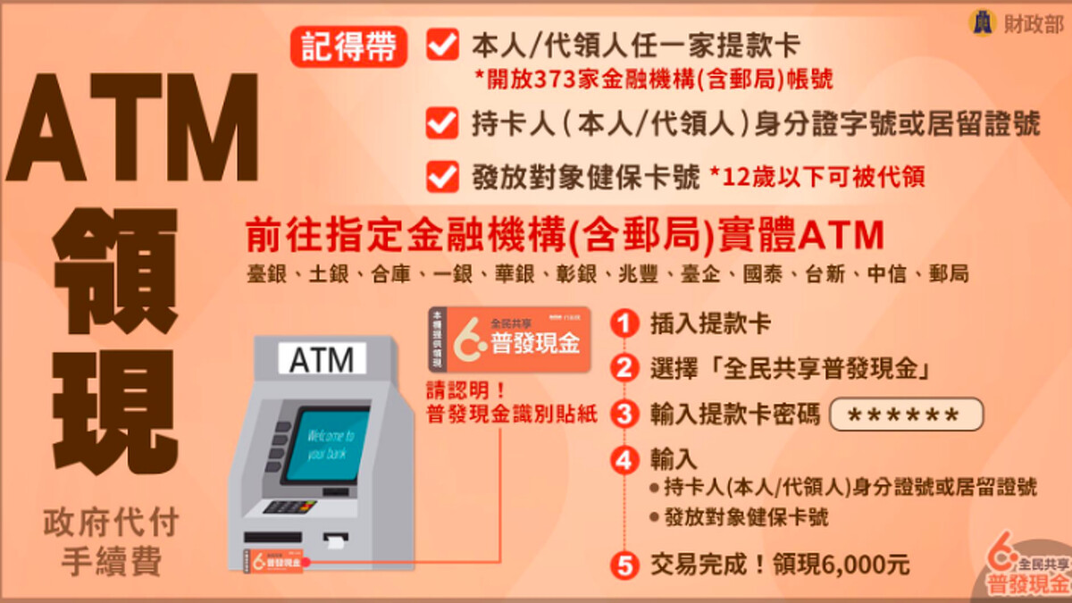 2. ATM領現:至12家指定金融機構(含郵局)實體ATM領取
