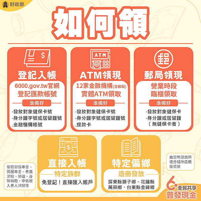 發放方式規劃採線上申請「登記入帳」、「ATM領現」、「郵局領現」、「直接入帳」及「特定偏鄉造冊發放」5種方式,方便民眾領取。