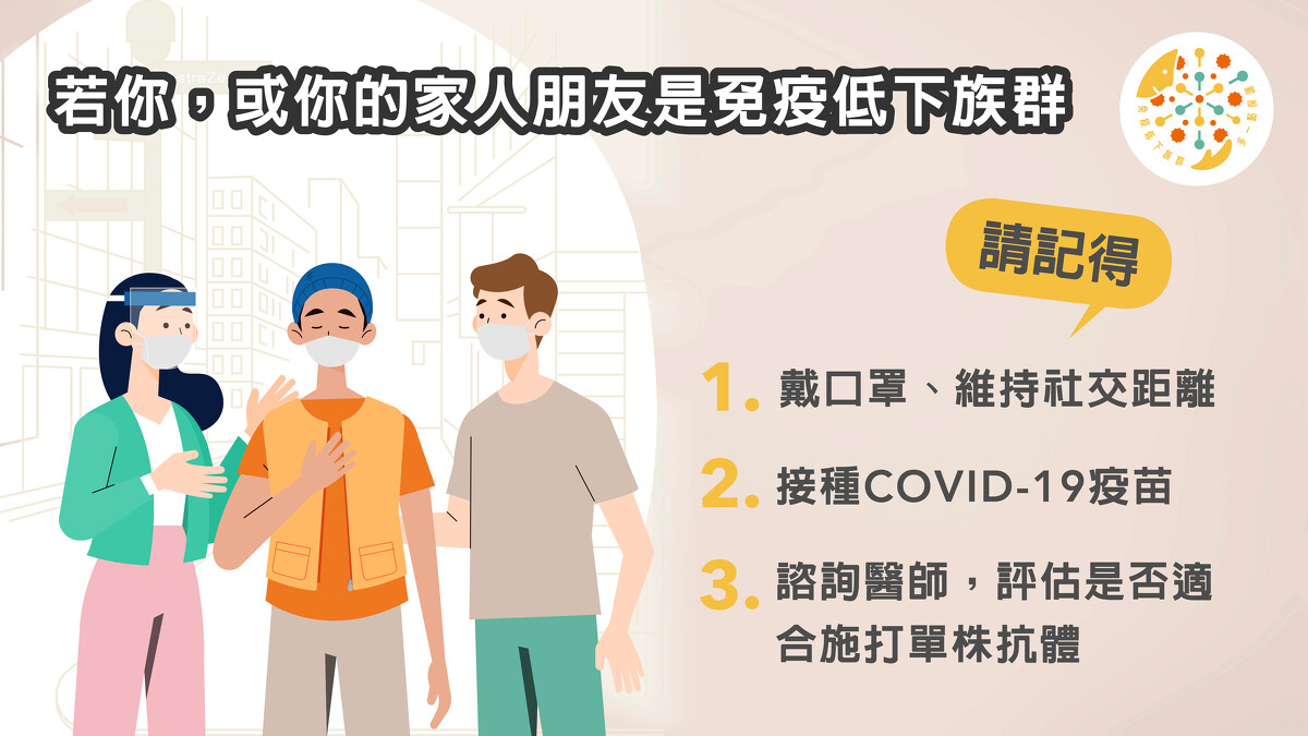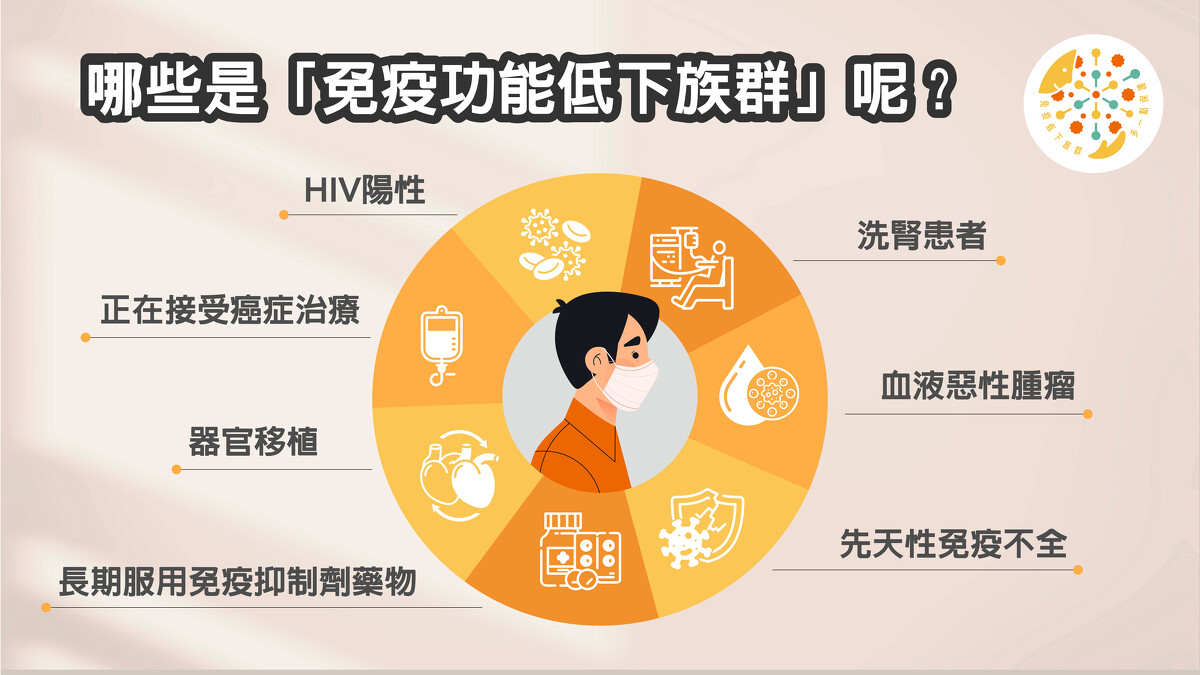 全世界有約2%的免疫低下病友,在台灣約有60萬人,像是正在接受癌症治療、血液惡性腫瘤、長期服用免疫抑制劑藥物、HIV、洗腎、器官移植,或是先天性免疫功能不全的病友,他們因為自身免疫功能較弱,所以需要更小心的保護好自己。在疫情期間,即使施打疫苗獲得的保護力也比一般人低,若染疫則會伴隨較高的住院、重症及死亡風險。