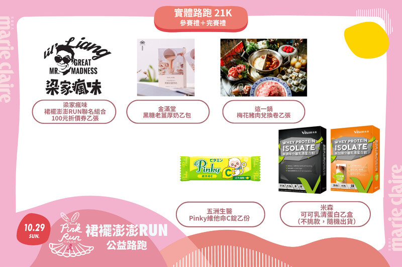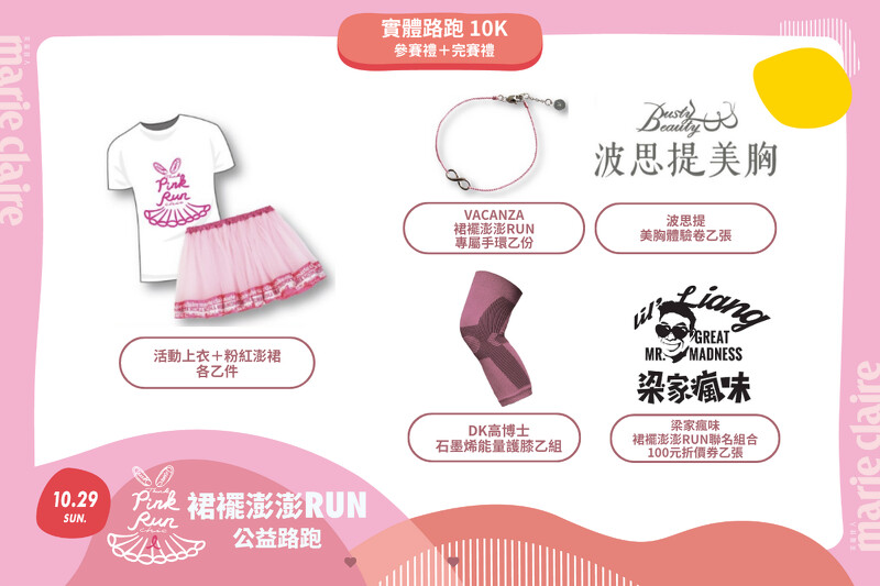 最後參加最親民的歡樂4K小澎裙組,也有豐富禮物可以拿唷!其中有vacanza裙襬澎澎RUN專屬手環、波思提美胸體驗卷、霓淨思精選商品組、這一鍋指定商品兌換餐券、梁家瘋味裙襬澎澎RUN聯名組合、五洲生醫Pinky維他命C錠、金滿堂黑糖老薑厚奶,以及米森好菌搖搖系列體驗組(兩入)或草莓莓果脆麥片等多樣實用補給好物。