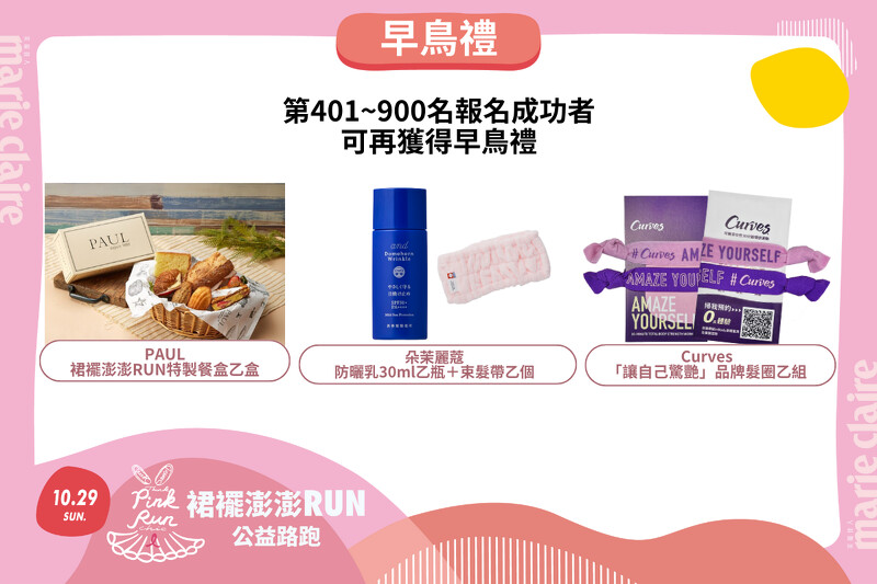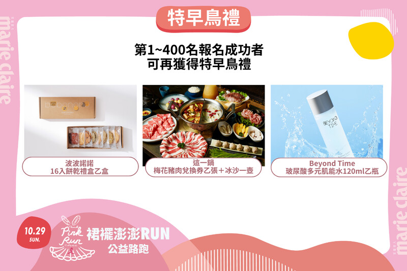 首波報名第1-400位報名且繳費完成者,可再獲得特早鳥禮,內容包括「波波諾諾」餅乾禮盒、「這一鍋」指定商品兌換餐券,以及「Beyond Time」玻尿酸多元肌能水。第401-900位報名且繳費完成者可再獲得早鳥禮,有以麵包、甜點聞名世界的「PAUL」提供的特製餐盒、「朵茉麗蔻」防曬乳+束髮帶,還有「Curves」品牌髮圈組。