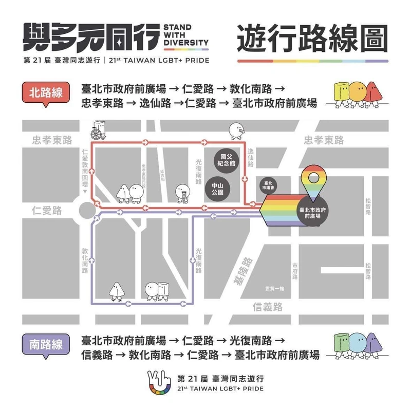 2023同志大遊行北路線:臺北市政府前廣場(市民廣場) → 仁愛路 → 敦化南路 → 忠孝東路 → 逸仙路 → 臺北市政府前廣場(市民廣場)