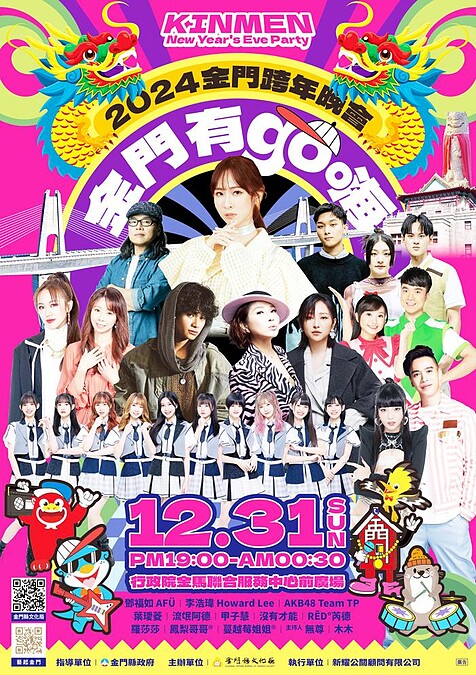 離島也很嗨!「2024金門跨年晚會」主題定為「金門有go嗨」,由林葦妮、無尊擔任主持人,歌手卡司有女子偶像團體AKB48 Team TP、東森幼幼台蔓越莓姐姐、鳳梨哥哥、《星光大道》踢館魔王羅莎莎、靈騷女聲RĒD° 芮德、創作歌手李浩瑋、金嗓歌后葉璦菱、台語歌手甲子慧、創作歌手流氓阿德、男女混聲演唱組合沒有才能、壓軸歌手為鄧福如。每年度的抽獎環節也沒少,禮物包含小冰箱、多功能料理鍋、烤盤組、電磁爐、冷暖循環扇、7-11商品卡、USB隨行風扇,最大獎是微型電動二輪車。
