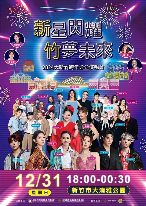 由新竹縣市民間單位首度合辦的「2024大新竹跨年公益演唱會」,是睽違8年舉辦的跨年公益演唱會活動,以「新星閃耀・竹夢未來」為題,卡司有白冰冰、彭佳慧、安心亞、熊仔、李千娜、張涵雅、婁峻碩、U:NUS、Saturnday、艾薇、J.Sheon、張庭瑚、白安、Kevin廖柏雅、同理Zunya、陳思瑋等15組陣容。倒數完會發射300秒高空煙火,並有美食攤位市集,一連6小時跨年晚會嗨到最高點。
