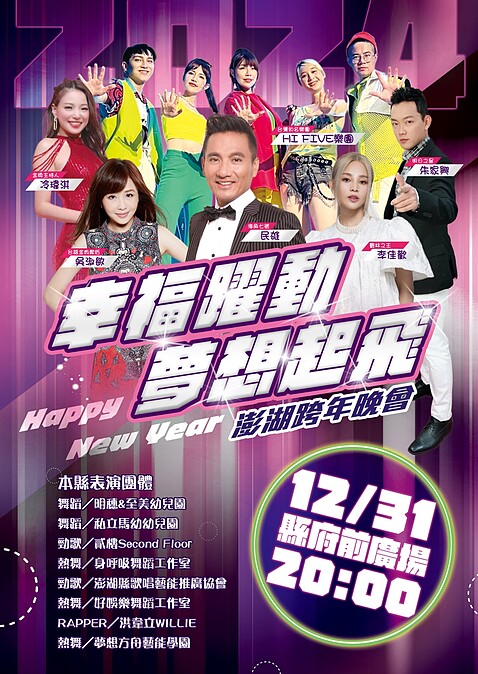 最大離島:澎湖的2024跨年晚會終於公布!「幸福躍動 夢想起飛,澎湖跨年晚會」將從晚間8點開始,由冷瑋淇擔任主持人,卡司有民雄、吳淑敏、李佳歡、朱家興、Hi Five樂團,以及當地的舞蹈團體帶來勁歌熱舞演出。