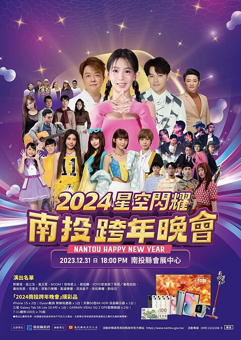 擁有好風光的南投,也公開跨年演唱會陣容啦!「2024星空閃耀 南投跨年晚會」主持人為廣播主持人胖胖、岑妮,卡司包含郭書瑤 瑤瑤、金曲歌王翁立友、黃文星、超人氣組合Boom!怪物星人、台語唱將蔡佳麟、創作才子克里夫、客語歌手劉佳玟、庸俗救星、老拓樂團Pioneer、流浪盒子、原動力樂團、亂貓樂團、 YOYO家族。另外也會抽出大獎有iPhone15、Dyson吸塵器、50型4K液晶螢幕Garmin智慧手錶等。