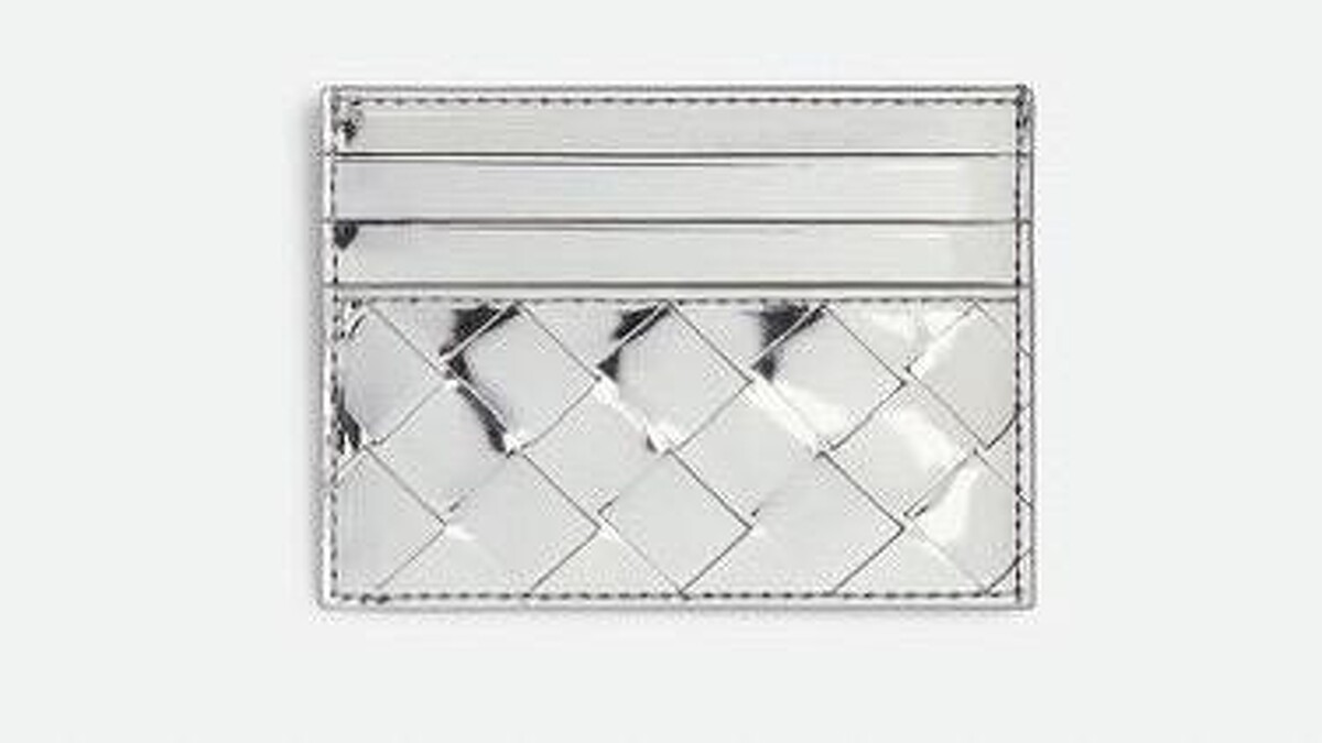 Bottega Veneta推出了非常有聖誕感的金、銀色系皮件與包款系列,其中這款三層卡夾,以寬皮革編織打造,銀色系的科技前衛感,就算過了聖誕使用也不會覺得奇怪。價格: NT16,400