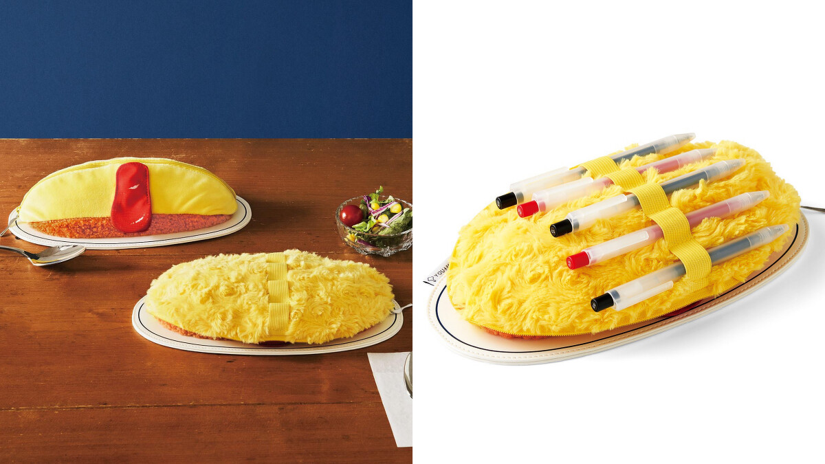 超逼真的蛋包飯,其實是筆袋!將中間像餐刀般的拉鍊拉開後,就可以放置物品,拉上後即可做出滑嫩的日式蛋包飯!這道使用絨毛材質製作的的蛋包飯,擺放在桌上很賞心悅目。