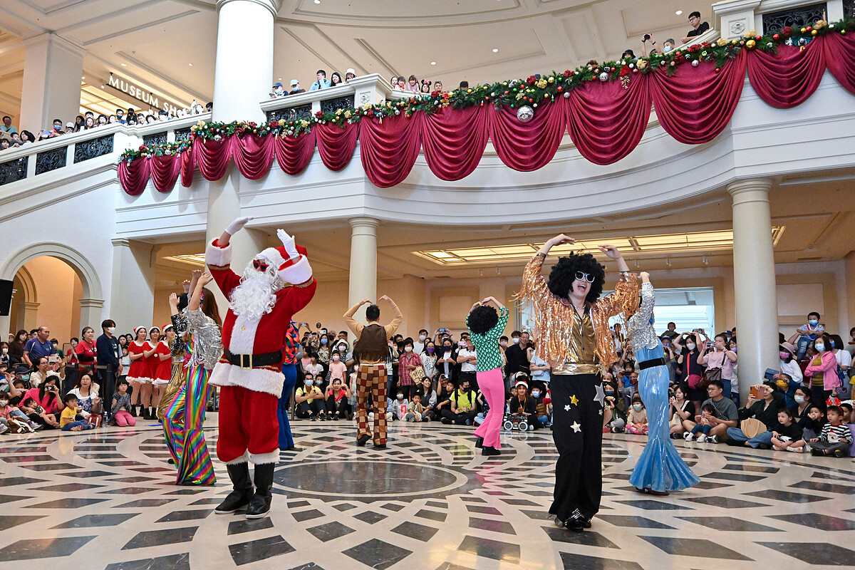 「2023奇美聖誕週末」為呼應年度特展《跳出格子吧!機器X材料X藝術超展開》的懷舊氣氛,精心打造一場充滿70年代DISCO復古風潮的盛會。活動一開始,聖誕老公公與群星隊伍以經典DISCO裝扮亮相,喇叭褲、連身褲等多樣造型,搭配誇張耳環、個性墨鏡、爆炸頭等元素,形成強烈的視覺焦點,讓人彷彿置身70年代的流行現場。
