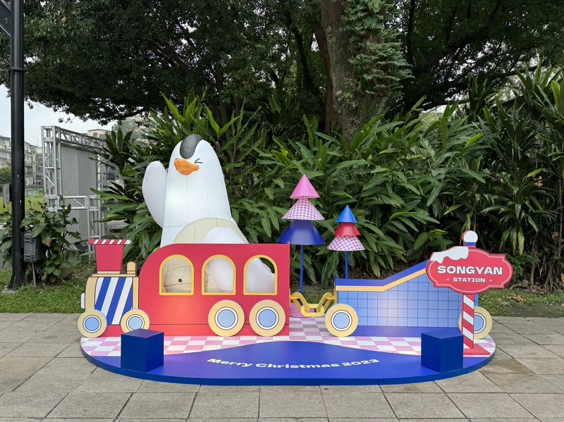這次是松山文創園區首次以鍋爐房煙囪藝術創作,以萌趣十足的巨型鴨屁股,幽默致敬聖誕老人透過煙囪送禮物的經典典故,靈活展現古蹟不同的可能性!同時在園區椰林口展出「松鴨桑聖誕列車」,松鴨桑帶著送給大家的禮物,乘著列車出發,如同聖誕老人駕著雪橇傳遞聖誕幸福,打造出聖誕節的儀式感!冷冷的天,大家跟松鴨桑的可愛屁屁合照後,不妨去吃個薑母鴨去去寒氣~(笑)