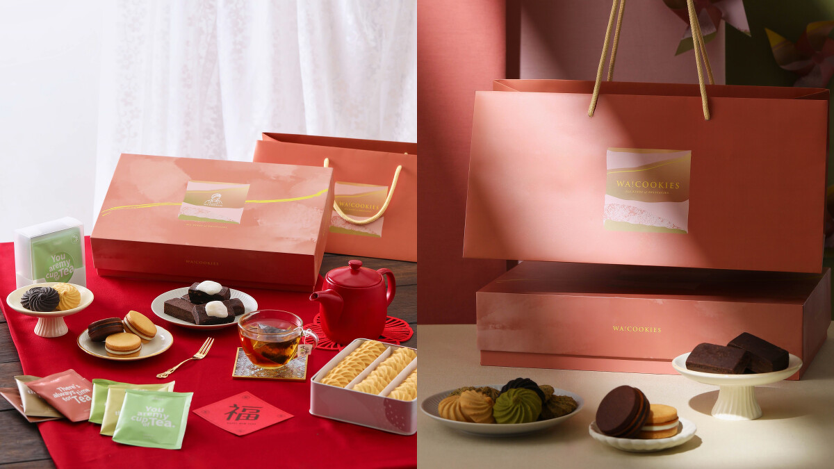 由YouTuber古娃娃創立的點心品牌「WA!COOKIES」首度攜手台中手搖茶飲品牌「吃茶三千」,推出春敘過年禮盒「曲奇X茶盒」。酥鬆曲奇餅完美搭配清新茶香,共有8款經典風味選擇,包含原味焦糖奶油、重可可、鐵觀音濃茶和靜岡抹茶等等,入口即化的酥鬆與各式茶品創造出甜度低、高層次的口感。還有「古朗尼」與「雙餡夾心餅乾」兩款禮盒,古朗尼顛覆市場對布朗尼鬆軟甜膩的既定印象。雙餡夾心餅乾則以冰心系甜食為特點,1公分厚內餡飽含2種餡料打造「厚食」療癒感。