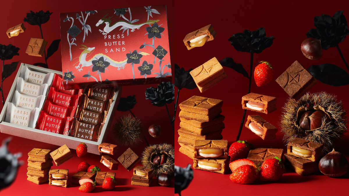 日本人氣伴手禮 PRESS BUTTER SAND推出的限量龍年過年禮盒,有三種口味,包括經典原味、酸甜草莓以及秋冬限定的的栗子,甜而不膩口的好滋味絕對讓收禮的人看到超開心。再加上禮盒設計由日本知名插畫家柊有花操刀,以一貫的柔和風格展演年終感謝、紅白與銅色搭配象徵花開富貴,整個看起來就是喜氣洋洋!2024年1月12日在新光三越鑽石塔旗艦店限定發售,每盒12入、售價NT$1,180元。